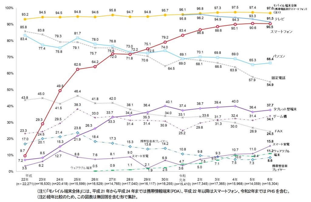 以下の総務省の調査では、2025年度のモバイル端末の世帯所有率は97.0%で、その中でスマートフォンの世帯保有率は90.5%と最も高くなります。さらにインターネット利用率が全体で85.6%である中で、スマートフォンを介する利用はそのうち74.4%です。このように、国民の生活にスマートフォンを中心としたモバイル端末が根付いているために、それを前提としてビジネスシーンでも今後ますますのDX化が進むことが推測されます。