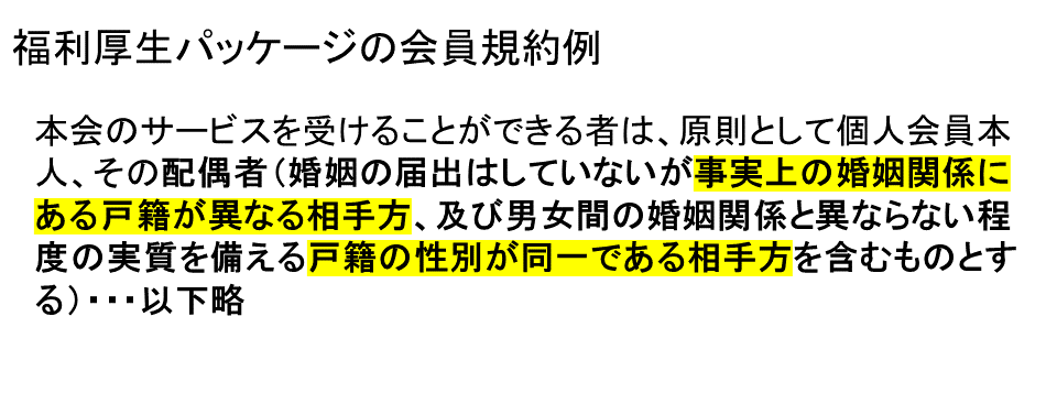 - 慶弔給付―結婚祝い・出産祝い・子の入学祝い・家族の死亡弔慰金なども事実婚パートナーまで拡大