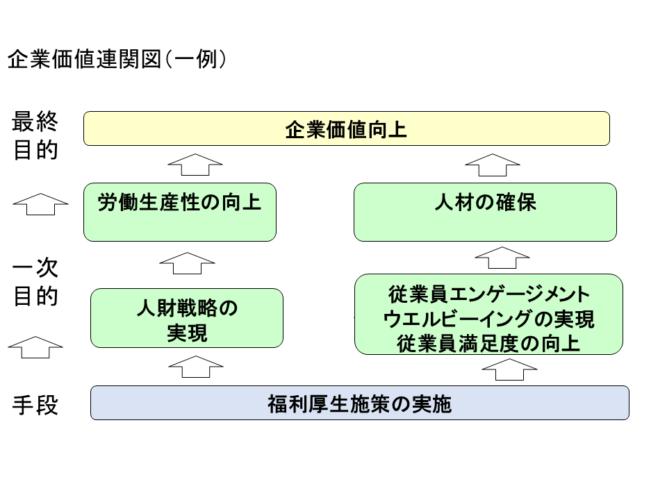 - 福利厚生→社員満足→信頼関係→エンゲージメント向上→社員定着→企業業績向上