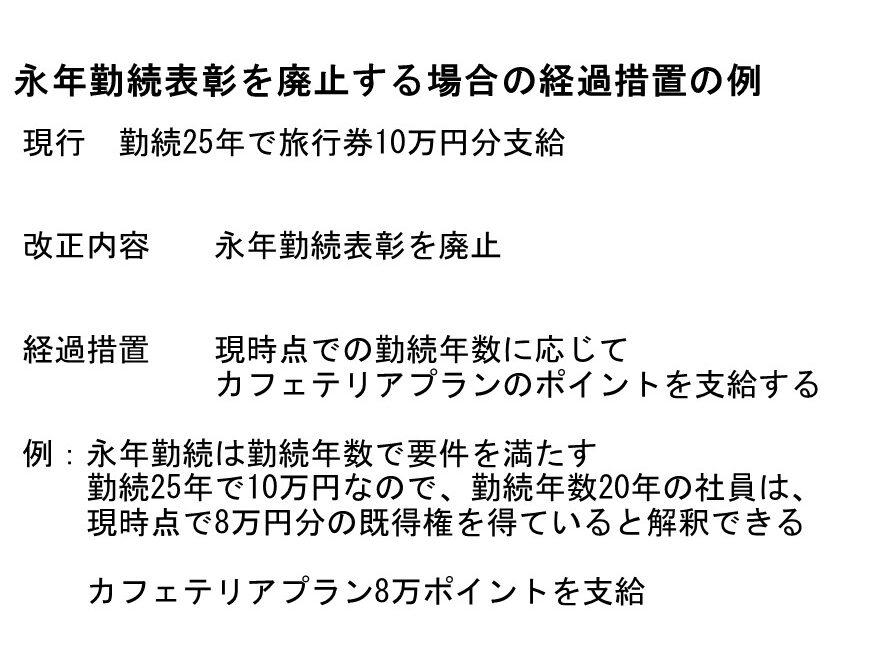 - 代替案:カフェテリアプラン・退職金への加算など合理的な経過措置