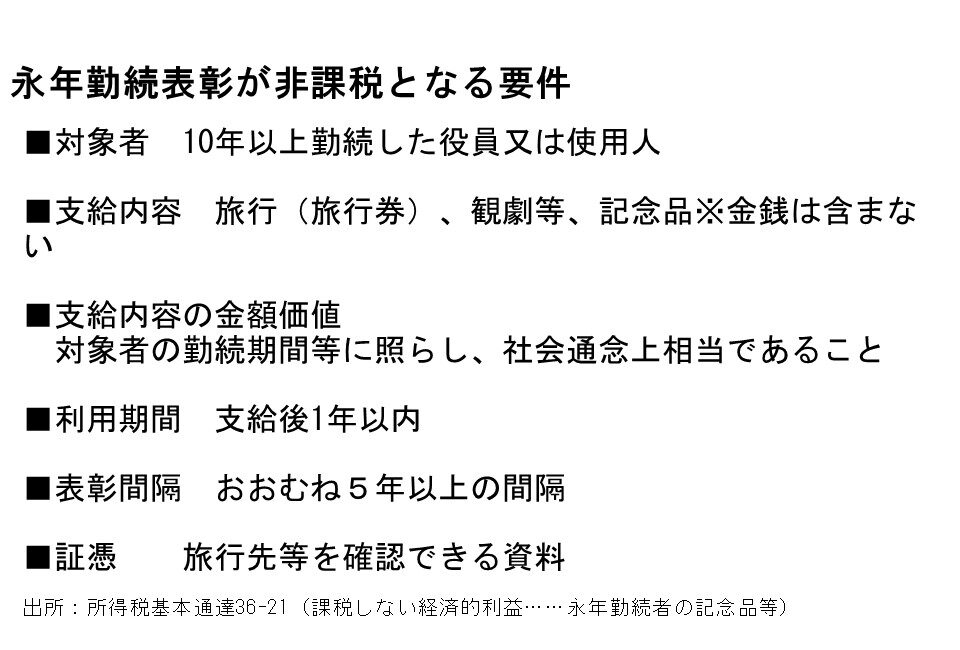 - 非課税条件は「業務に必要な長期勤務の節目を迎えた社員への表彰」「旅行券や記念行事予約など従来型が中心」