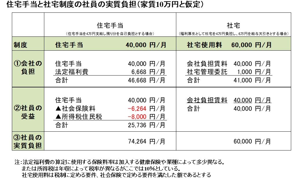 - 住宅手当は税金・社会保険料の対象。社員の実質負担は手当4万円支給でも約7.4万円。