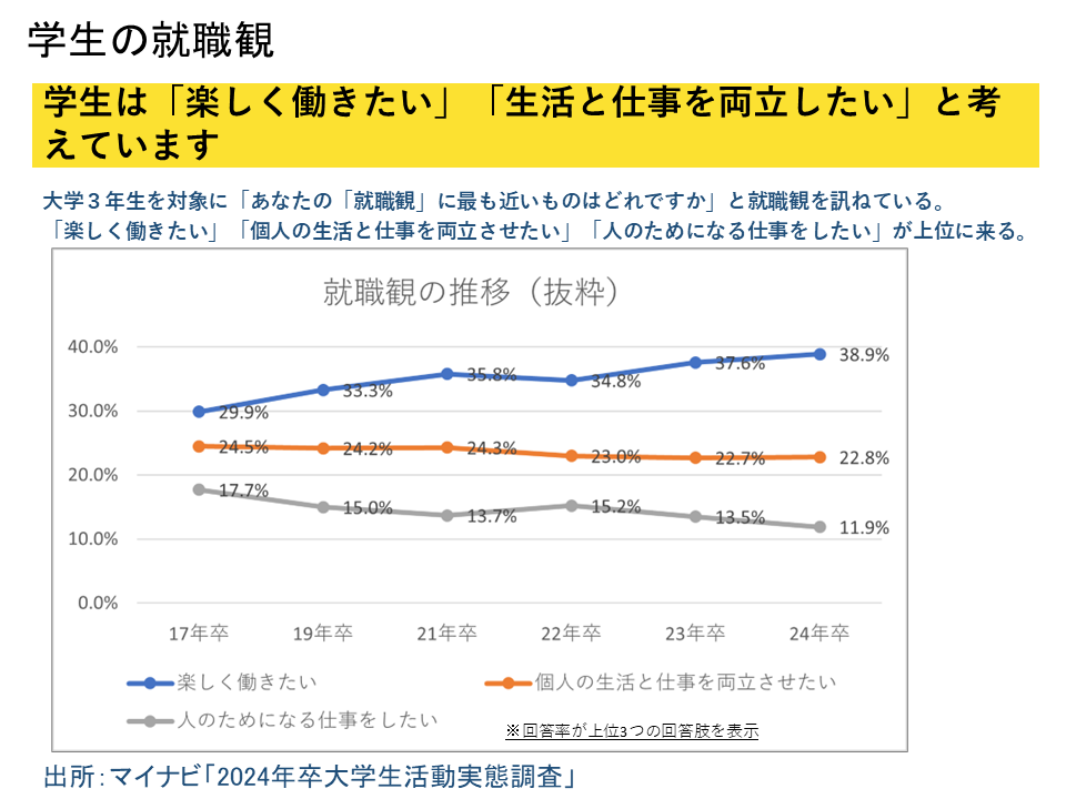 若手社員や新卒は「休みが多くて楽しく働きたい」「プライベート重視」の傾向が強く、特別休暇は就職希望者の注目ポイント。